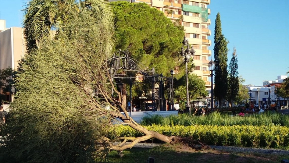 Hasta la plaza San Martín sufrió los embates del fuerte viento que azotó a Santa Rosa entre la noche del sábado y la madrugada del domingo. Un árbol ubicado en uno de los canteros que da a la calle Yrigoyen, cerca de la glorieta, fue víctima de las ráfagas que la oficina local del Servicio Meteorológico Nacional estimó en 67 kilómetros por hora. Como en muchos otros sectores de la ciudad, el ejemplar fue arrancado de cuajo y quedó caído en el piso con sus raíces expuestas.