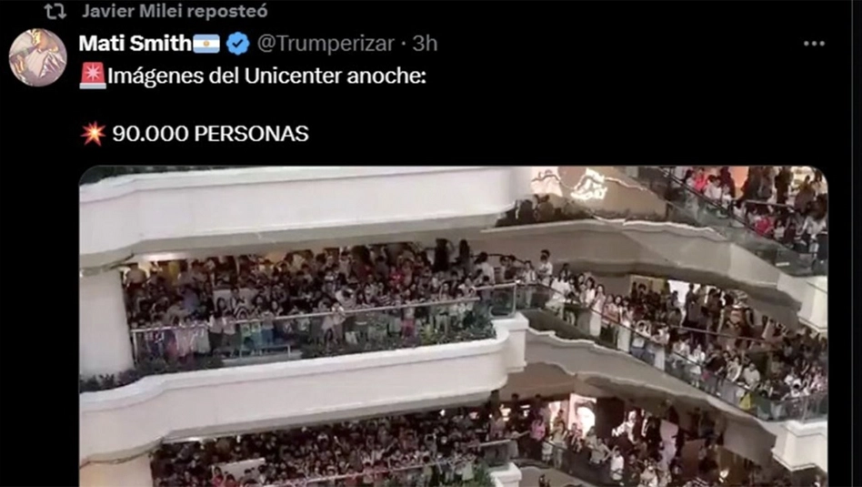 “Imágenes del Unicenter anoche: 90.000 personas”, fue el tuit que difundió el mandatario libertario junto a un video y una foto del supuesto shopping bonaerense. Milei retuiteo a la cuenta "Trumperizar", que se hace llamar Mati Smith y forma parte de la granja de trolls que propalan la propaganda libertaria.