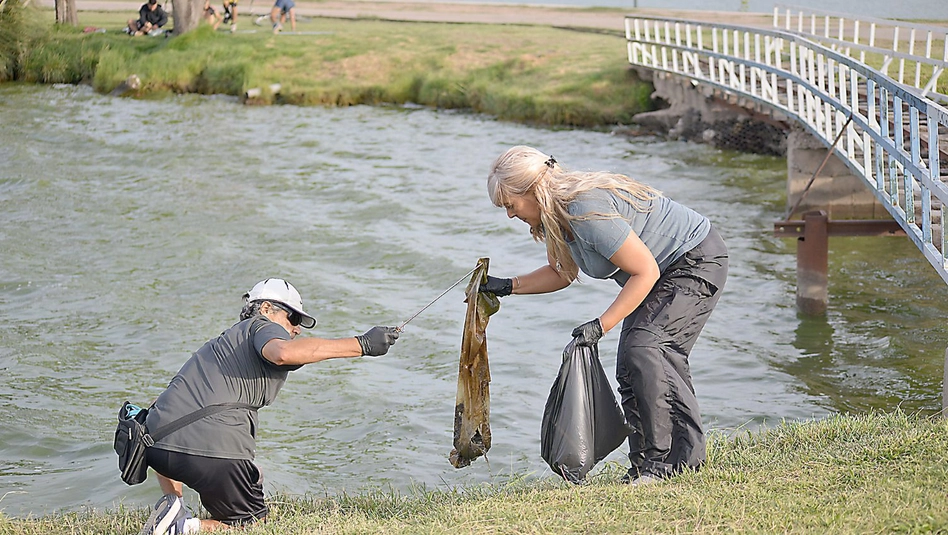 Con guantes, bolsas para la basura y picos para pinchar plásticos, integrantes de la Fundación Sri Sathya Global Council de Argentina se reunieron en el Parque Recreativo Laguna Don Tomás para recolectar basura.