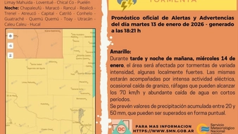 "Durante tarde y noche de mañana, miércoles 14 de enero, el área será afectada por tormentas de variada intensidad, algunas localmente fuertes", recordó el área de Defensa Civil. "Las mismas estarán acompañadas por intensa actividad eléctrica, ocasional caída de granizo, ráfagas que pueden alcanzar los 70 km/h y abundante caída de agua en cortos períodos", añadió en base al reporte del SMN.
