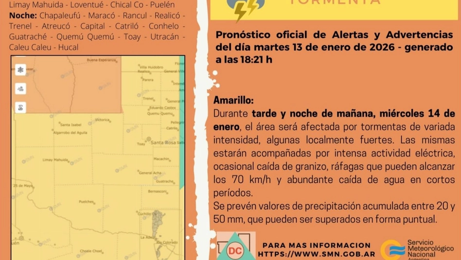 Según el reporte difundido por Defensa Civil, para la tarde de este miércoles rige el alerta para los departamentos de Curacó, Lihuel Calel, Chalileo, Limay Mahuida, Loventué, Chical Co y Puelén. Para la noche, añade el alerta del SMN, es para Chapaleufú, Maracó, Rancul, Realicó, Trenel, Atreucó, Capital, Catriló, Conhelo, Guatraché, Quemú Quemú, Toay, Utracán, Caleu Caleu y Hucal.