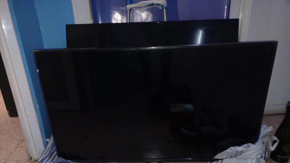 En el carro de mano de un eje, llevaba envueltos en una sabana dos televisores; uno marca Goldstar de 40 pulgadas y un TCL de 49 pulgadas.