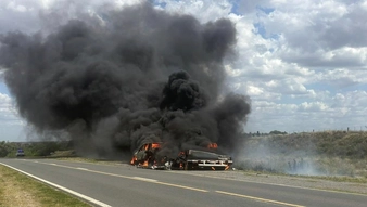 Un voraz incendio se desató este lunes por la tarde en la ruta nacional 35, a unos 25 kilómetros al sur de Winifreda. El fuego consumió por completo una camioneta, un tráiler y cuatro piletas de fibra de vidrio que estaban siendo transportadas y quedaron reducidas a cenizas. Las pérdidas materiales fueron totales. Yonathan, propietario de la empresa Piscinas Clear Water, ubicada en Córdoba Capital, expresó con angustia: “Fue una pesadilla, en diez minutos perdimos todo”.