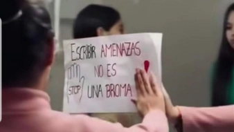 Se trata de un video filmado en uno de los sanitarios del colegio. Las imágenes muestran a dos alumnos varones que ingresan riendo a un baño femenino y fijan en el espejo del lavabo, un cartel que reza: “Mañana hay tiroteo, no vengan”.