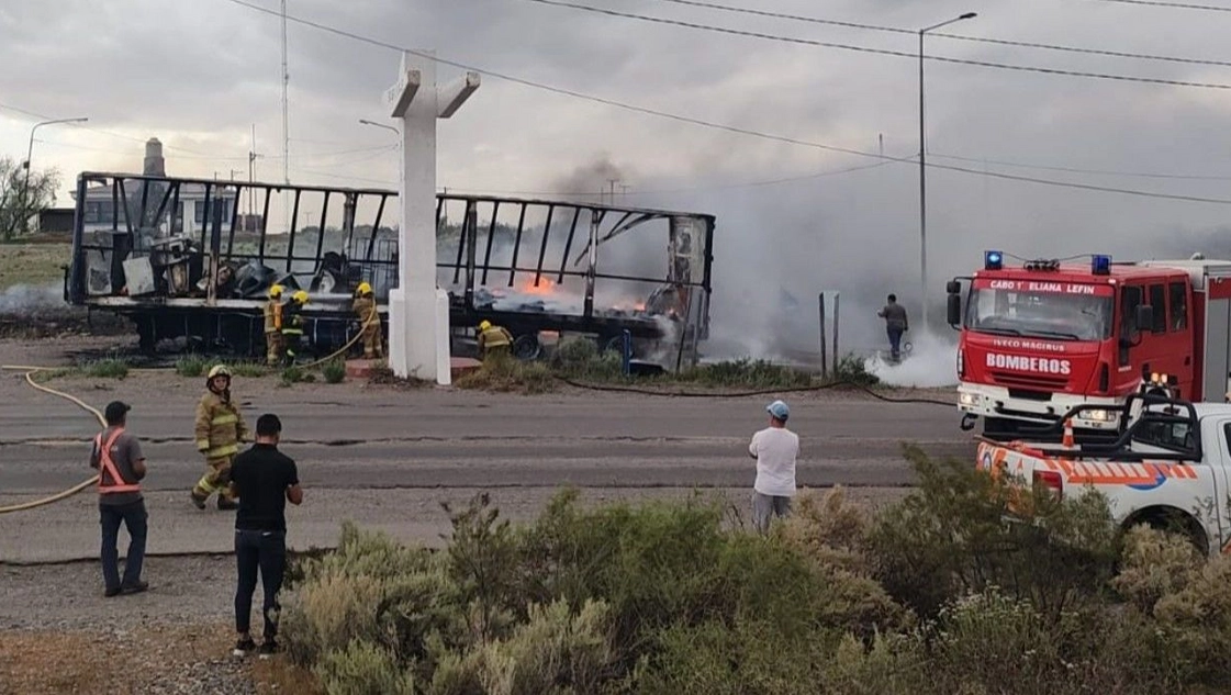 En un momento, el conductor, al notar lo que inicialmente pensó que era tierra, descendió del vehículo y descubrió que se trataba de humo. Rápidamente, estacionó detrás del monolito de “Bienvenidos a Río Negro” y logró desenganchar el tráiler que ardió en llamas casi de inmediato. Con ésa acción logró salvar el tractor del convoy.