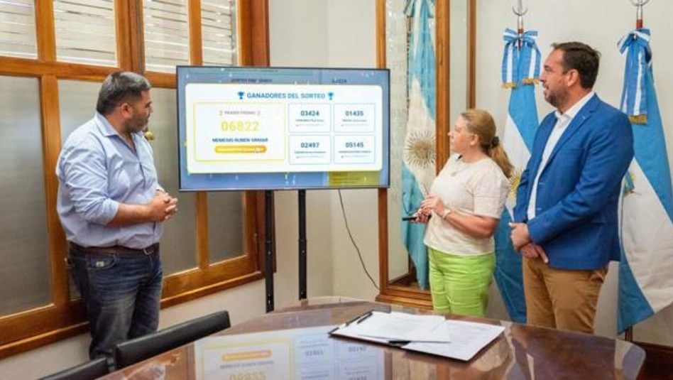 El intendente de Luciano di Nápoli encabezó esta mañana, y fue replicado en redes sociales, el Sorteo del Buen Contribuyente de este año: otorgaron un auto cero kilómetro y cuatro motos.