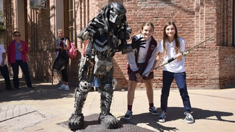 Apenas dio unos pasos hacia la calle, la atracción fue inmediata. De los chicos y de los grandes. Era el horario de salida de escuelas y colegios y por eso niños y adolescentes se acercaron enseguida para hacer esa pregunta que, a esta altura, deber ser la que más escuchó en su vida: ‘¿nos podemos sacar una foto?’. Y ese rostro que apenas asoma detrás de la máscara, del casco, de las calaveras, de los rayos láser, de la lanza y de todos los accesorios que componen su aparatoso traje negro se dispuso con una sonrisa para la imagen que enseguida voló hacia las redes sociales.