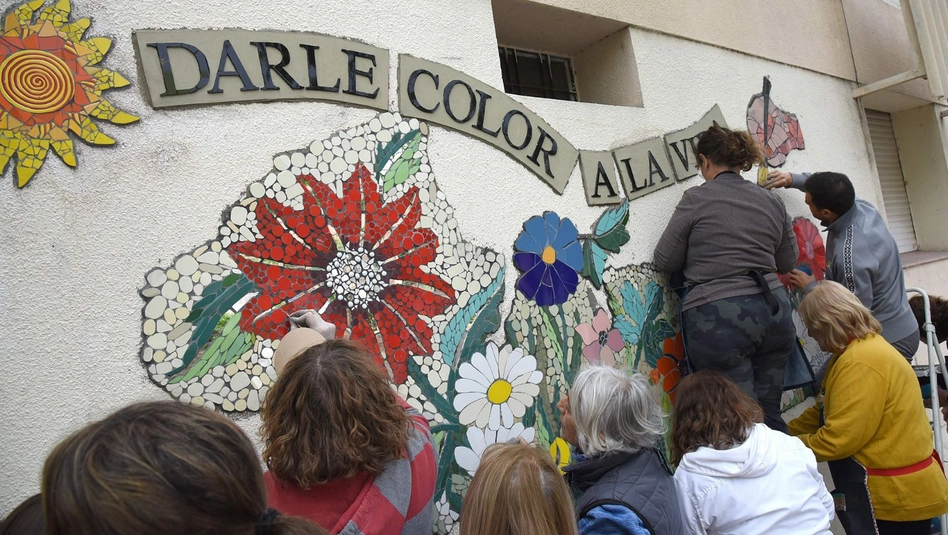 “Hoy (por ayer) comienza la Semana del Estudiante Solidario y, si bien tenemos terminado el mural hace 15 días, queríamos inaugurarlo en esta fecha. Este es nuestro regalo para ustedes”, dijo y el público aplaudió. Luego explicó que compraron los azulejos y con una tenaza cortaron los pedazos pequeños. “En función de los colores que teníamos hicimos el diseño. Lo pegamos sobre una red y hoy lo pegamos en la pared. Es una obra de hormigas. Les regalamos todo nuestro tiempo y nuestro trabajo a ustedes”, afirmó y una de las residentes destacó el “trabajo inteligente” y la “paciencia” de las artistas.