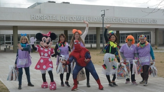 Es la tarde del sábado, faltan todavía algunas horas para el Día de las Infancias, y un grupo colorido de mujeres llama la atención entre el gris de la tarde nublada y del predio que conecta los hospitales Lucio Molas y René Favaloro. Caminan entre charlas y risas, llevan pelucas, sombreros, anteojos y muchas bolsas con regalos, incluso van acompañadas por Minnie Mouse y Spiderman.