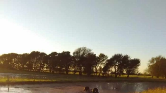 Un auto volcó en una cuneta con agua en la ruta 35