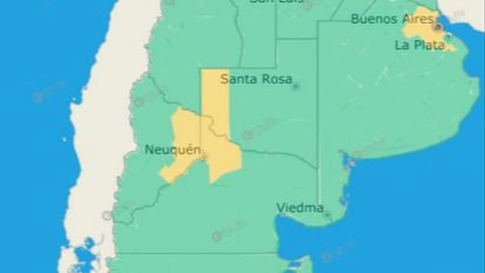 Por otro lado, también está en alerta el noroeste de la provincia de Río Negro: General Roca - Villa Regina - Catriel.