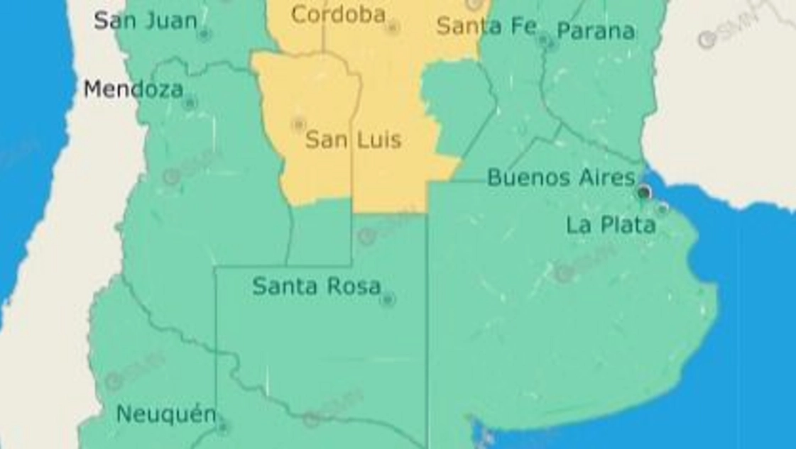 Según SMN se generarán tormentas y las precipitaciones acumuladas podrían superar los 40 mm, en el noreste de Río Negro,también en el centro y en el norte de la provincia de La Pampa y también en el centro y el noreste de Córdoba y en el centro y norte de San Luis. En esta zona central de la Argentina, las lluvias podrían sostenerse de manera persistente.