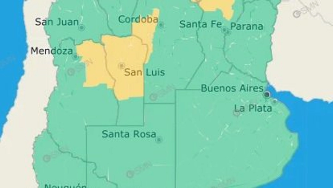 Por lo tanto, desde el Servicio Meteorológico Nacional (SMN) se publicó un alerta amarillo para el oeste de Córdoba, casi toda la provincia de San Luis y el este de Mendoza. Tormentas fuertes que pueden derivar en tormentas fuertes, con intensa actividad eléctrica, con fuertes ráfagas de viento y quizás también granizo.