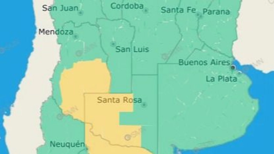 En ese contexto de tormentas para los próximos seis días, desde el Servicio Meteorológico Nacional (SMN) publicaron un alerta amarillo (a las 6.44 horas) para el oeste de la provincia de La Pampa, el sur de Mendoza y el norte de la Patagonia. Las tormentas podrían ser severas, con gran actividad eléctrica y fuertes ráfagas de viento y, quizás, también caiga granizo.