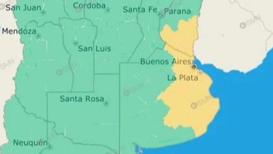 Para el día de hoy, el Servicio Meteorológico Nacional (SMN) indicó a las 6.29 horas, un alerta amarillo para el este y el norte de la provincia de Buenos Aires.