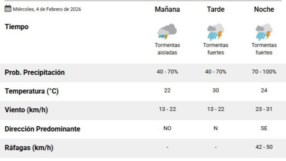 Según el Servicio Meteorológico Nacional (SMN) (en el pronóstico actualizado a las 6.22 horas), para este miércoles 4 de febrero en Santa Rosa la la temperatura mínima es de 18ºC y la máxima se va a ubicar en los 30 grados. La mañana comenzará con tormentas aisladas (40-70% de probabilidades), pero por la tarde y, sobre todo, por la noche las tormentas serán fuertes (70-100%). Durante la noche también podrían generarse ráfagas de viento de hasta 50 km/h, viento del sudeste. La humedad para la jornada del día de hoy es del 82%.