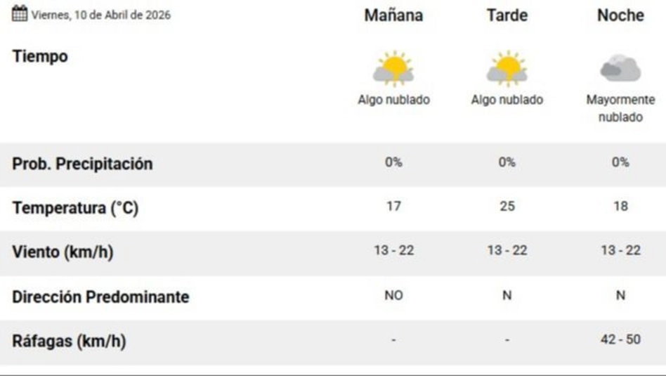 Para el sábado 11 de abril, el SMN indicó que va a ser una jornada muy ventosa, con viento que va a llegar del norte y que va a tener ráfagas de hasta 50 km/h. Todo el día va a estar nublado, entre el blanco y el gris, cubierto, mayormente cubierto. La temperatura mínima para este sábado va a ser 14 grados, sube la mínima, en tanto la máxima se va a mantener igual que toda la semana, en 24 grados.