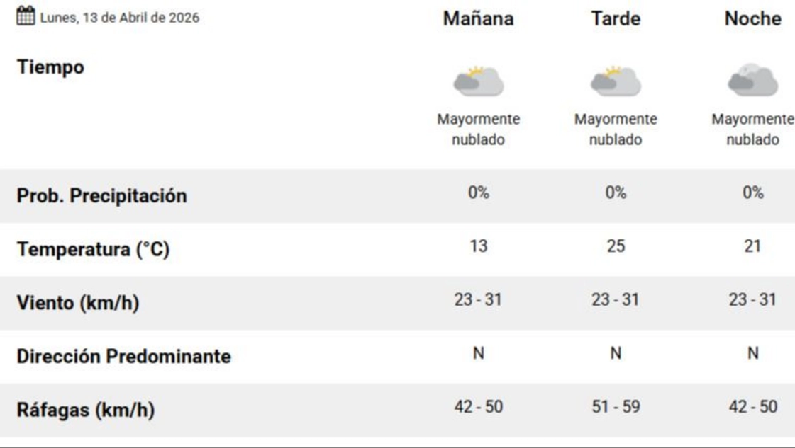 Desde el Servicio Meteorológico Nacional (SMN) (en el pronóstico actualizado a las 6.32 horas), indicó que para este lunes 13 de abril en Santa Rosa, se va a sentir el viento intenso del otoño. La mañana inició con una mínima de 13 grados y la máxima del día se va a ubicar en los 25°C. Va a ser un día agradable, con un cielo mayormente nublado, que solo de a ratos va a despejar y se va a ver un sol pleno escondido, agazapado, que va a estar ahí porque se siente el calor, pero de a ratos no se va a ver. La humedad se mantiene en 96%. El viento que llega es del norte, por eso el calor. Y se van a desarrollar ráfagas de hasta 59 km/h. El día se va a despedir cerca de las 18:54 horas.