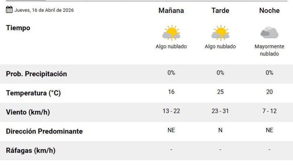 Desde el Servicio Meteorológico Nacional (SMN) (en el pronóstico actualizado a las 6.17 horas), indicó que para este jueves 16 de abril en Santa Rosa, se va a sentir un leve descenso de la temperatura por la mañana. Leve. Imperceptible. Mínimo. Un otoño que no termina de llegar, pero abre su paso. La mañana arranca con en 11 grados mientras que la máxima se va a ubicar en los 25°C. Va a volver a ser otro día agradable. Luminoso. Entre algunas nubes y un cielo enorme y despejado. La humedad para hoy es de 89%. El soplido del viento, un suspiro, llega desde el norte y del noreste. La noche gana lugar, oscurece temprano, pero antes el atardecer. Quizás naranja, quizás rosa y lila, como un campo de flores en el horizonte, se va a poner a las 18.50 horas.