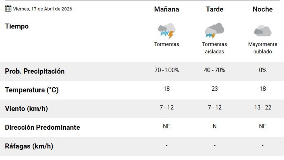 Desde el Servicio Meteorológico Nacional (SMN) (en el pronóstico actualizado a las 5.54 horas), indicaron que para este viernes 17 de abril en Santa Rosa, va a caer agua y que así se va a sostener todo el fin de semana. Va a arrancar con tormentas aisladas y la probabilidad es de 70-100%. Va a llover. El pronóstico indica que sí. Que se vienen tormentas por la mañana y tormentas aisladas por la tarde. Después va a parar. Pero por un rato, porque el sábado va a seguir igual de inestable.