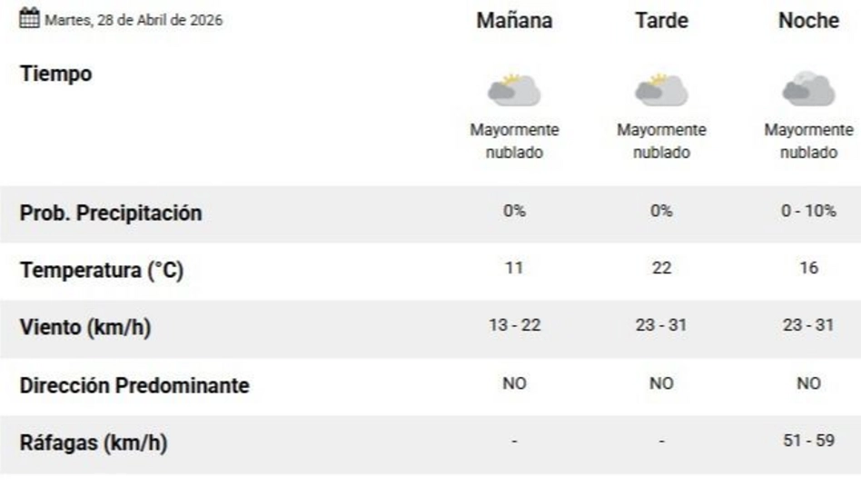 Por suerte hoy no hace tanto frío como ayer y desde el Servicio Meteorológico Nacional (SMN) (en el pronóstico actualizado a las 6.23 horas), indicaron que para este martes 28 de abril en Santa Rosa, va a hacer un poco más calor que ayer. Sube la mínima que para el día de hoy arrancó en 6ºC y la máxima se va a ubicar en los 22 grados. El resto de la semana se va a mantener así: ni tanto frío ni tanto calor. Durante todo este martes el cielo se va a mantener mayormente cubierto y el celeste del fondo se va a mezclar con la espesura de las nubes que se van a mover y van a hacer formas, formas para jugar y adivinar, con este viento que se las lleva y se las trae. La humedad para el día de hoy es de 81% y el viento va a llegar desde el noroeste con ráfagas de hasta 60 km/h durante la noche. Para las 18.35 horas va a llegar la noche.