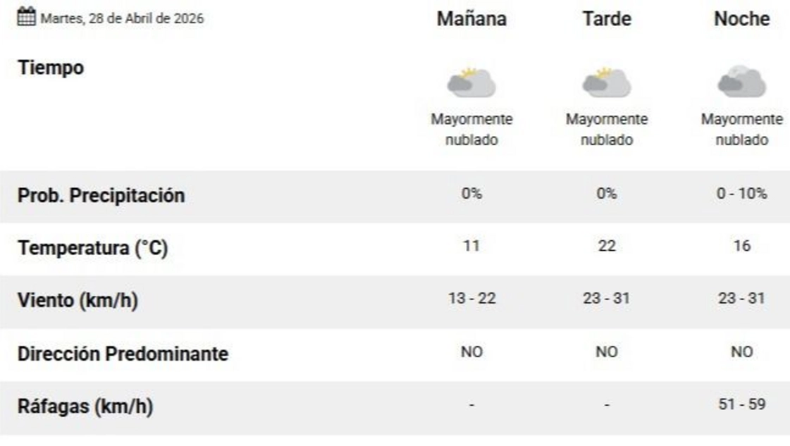 Para el miércoles 29 de abril, el SMN vuelve a pronosticar viento, viento y más viento, con ráfagas intensas. De esos vientos para los que no está sacar la bici ni la moto. Dan ganas de guardarse. Así va a amanecer y se va a sostener durante todo el día un viento sin descanso, con ráfagas de hasta 60 km/h. También van a llegar unos días de relativo calor, con una mínima de 12ºC y una máxima de 22 grados. El viento va a llegar desde el oeste y suroeste.