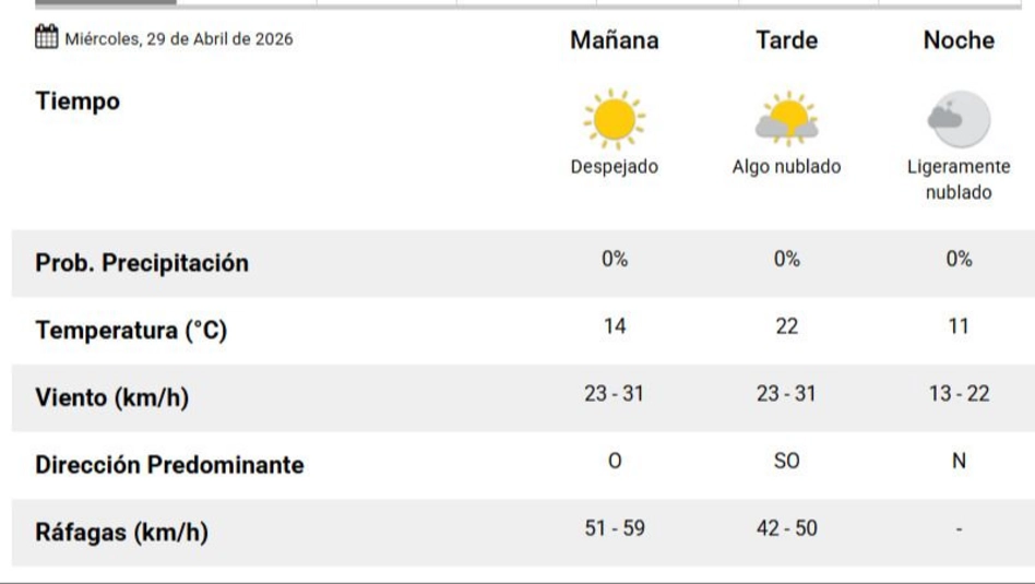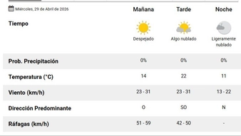 Amanece, de nuevo, frío, pero no tanto. Es una semana de relativa estabilidad y desde el Servicio Meteorológico Nacional (SMN) (en el pronóstico actualizado a las 6 horas), indicaron que para este miércoles 29 de abril en Santa Rosa, la mínima va a ser un poco más alta que los últimos días. Amanece con 11 grados y la máxima se va a ubicar en los 22. También amanece un cielo abierto, despejado, repleto de esperanza. Anoche cayeron unas gotas mínimas. Ya no. El pronóstico no indica que vaya a seguir lloviendo. Sí se va a cubrir leve el horizonte. Nada más. Después, viento. Viento sin descanso. Sin freno. Incómodo. Viento pampeano que se hace sentir, viento que llega del oeste, del suroeste y del norte con ráfagas de hasta 60 km/h. El sol se va a esconder cerca de las 18.34 horas.