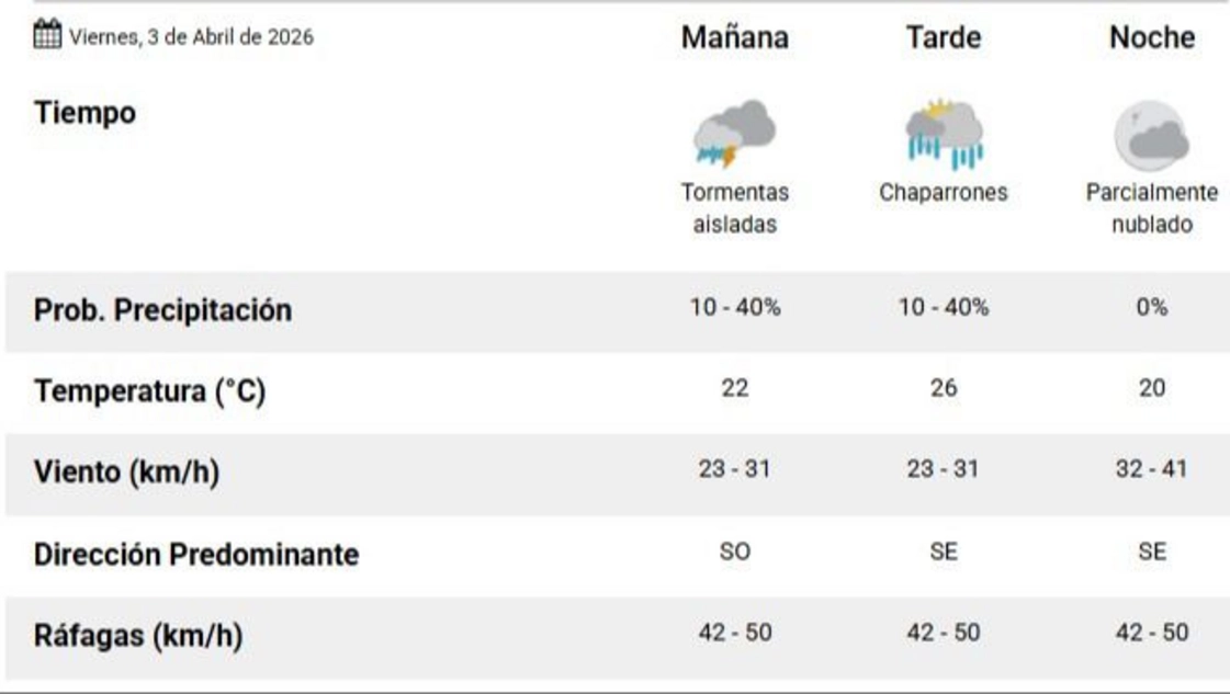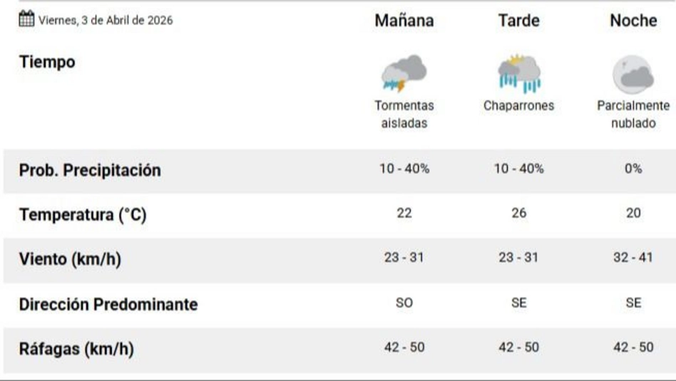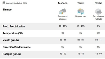 Para el sábado 4 de abril, desde el SMN indicaron que todo el día va a estar algo nublado y baja la temperatura. La mínima va a ser de 10 y la máxima de 18 grados. La dirección predominante del viento va a ser sureste, este y noreste y podrían desarrollarse ráfagas de hasta 50 km/h.