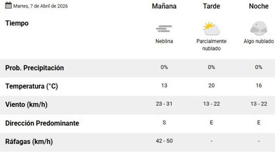 Para el miércoles 8 de abril, el SMN indicó que todo el día va a estar despejado y despejada también va a estar la noche. Alguna nube puede llegar a aparecer por ahí, insolente. La temperatura mínima va a ser de 10 y la máxima se va a ubicar en los 21 grados. La dirección predominante del viento va a ser suroeste y después noreste y después este.