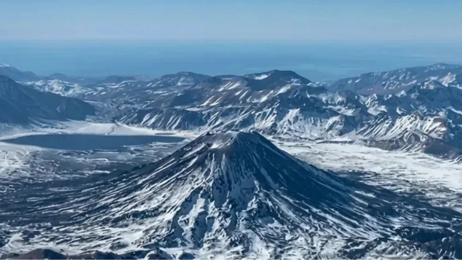 Filmó una vista impactante de un volcán con una laguna a sus pies