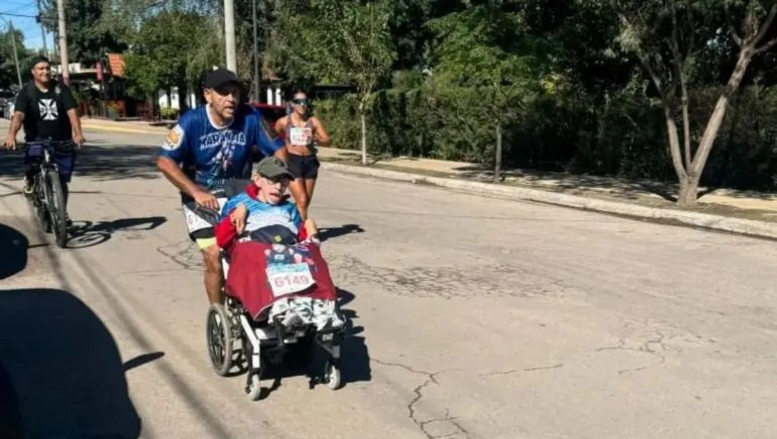 “Queremos dar este mensaje: se puede. Con fe, inclusión y sin bajar los brazos”, sostuvo el hombre que no se queda en las palabras y empuja a su hijo a cada paso que da sobre el asfalto.